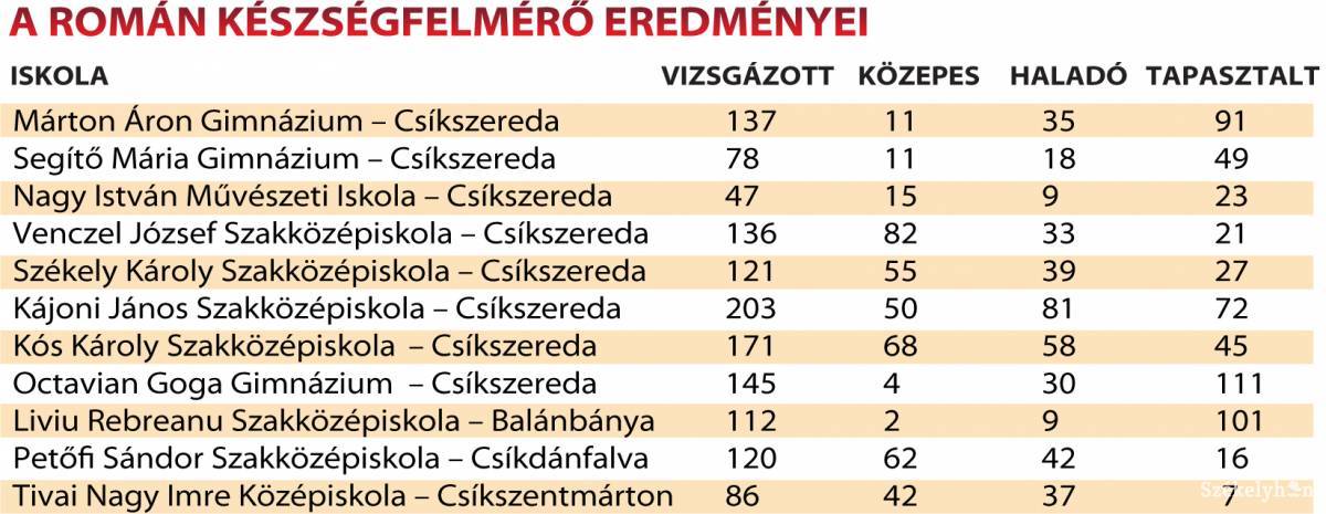 A Hargita Megyei Tanfelügyelőség adatai szerint a román nyelvi készségfelmérő érettségi vizsgán a megyebeli diákok többsége a legmagasabb szintű, tapasztalt besorolást kapta.
