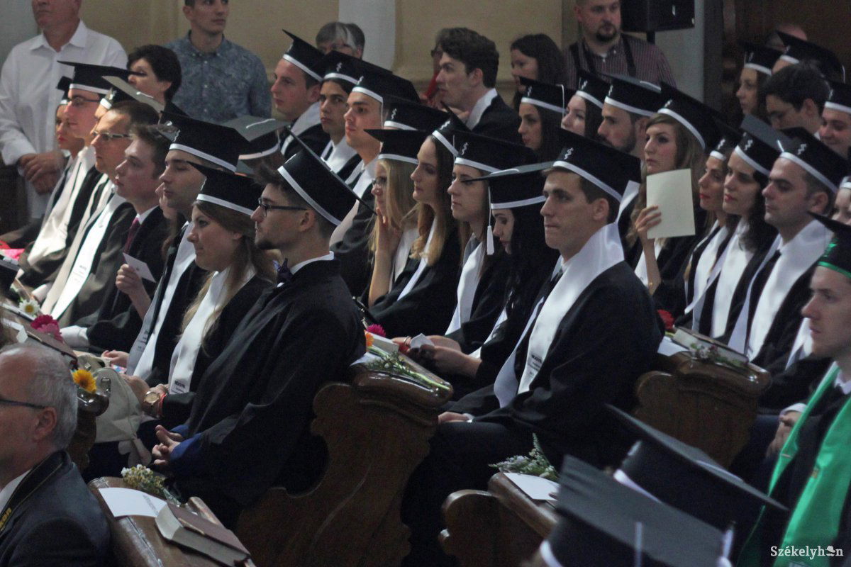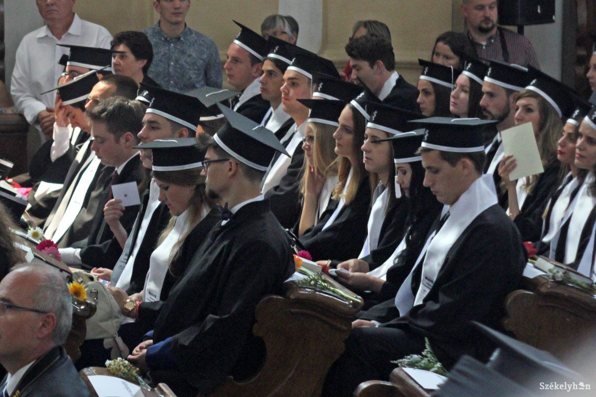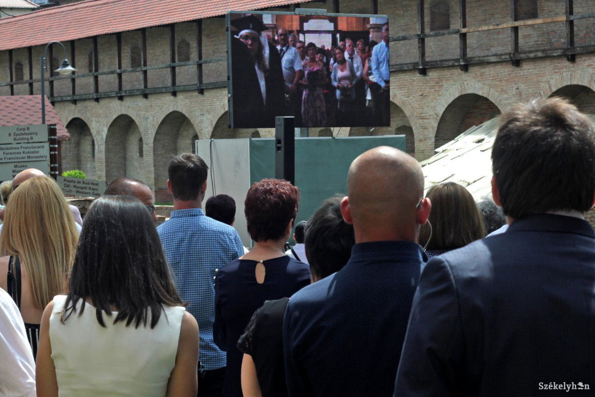 A felemelő ünnepségre, mint mindig, ezúttal is a vártemplomban került sor. Akinek nem sikerült bejutni Isten házába, az kivetítőn követhette az eseményt: szabadtéren a templom előtt, vagy tető alatt száz méterrel odébb, a vár konferenciatermében. A távollévők az idén Facebookon nézhették élő adásban a ballagást, melyen Nagy Előd rektor-helyettes búcsúztatója után Sipos Emese, az Erdélyi Múzeum-Egyesület Orvos- és Gyógyszerésztudományi Szakosztályának titkára díjazta a négy évfolyamelsőt.