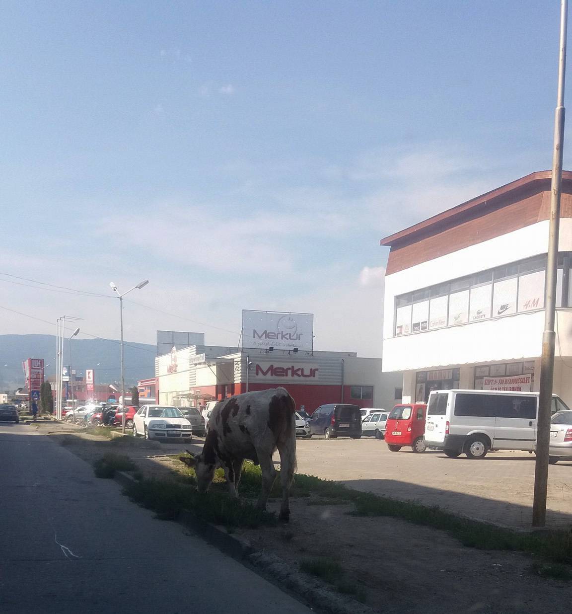 Tehén legelészik, látszólag zavartalanul a csíkszeredai Nagyrét utcában, a Merkúr áruház közelében a kora déli órákban.