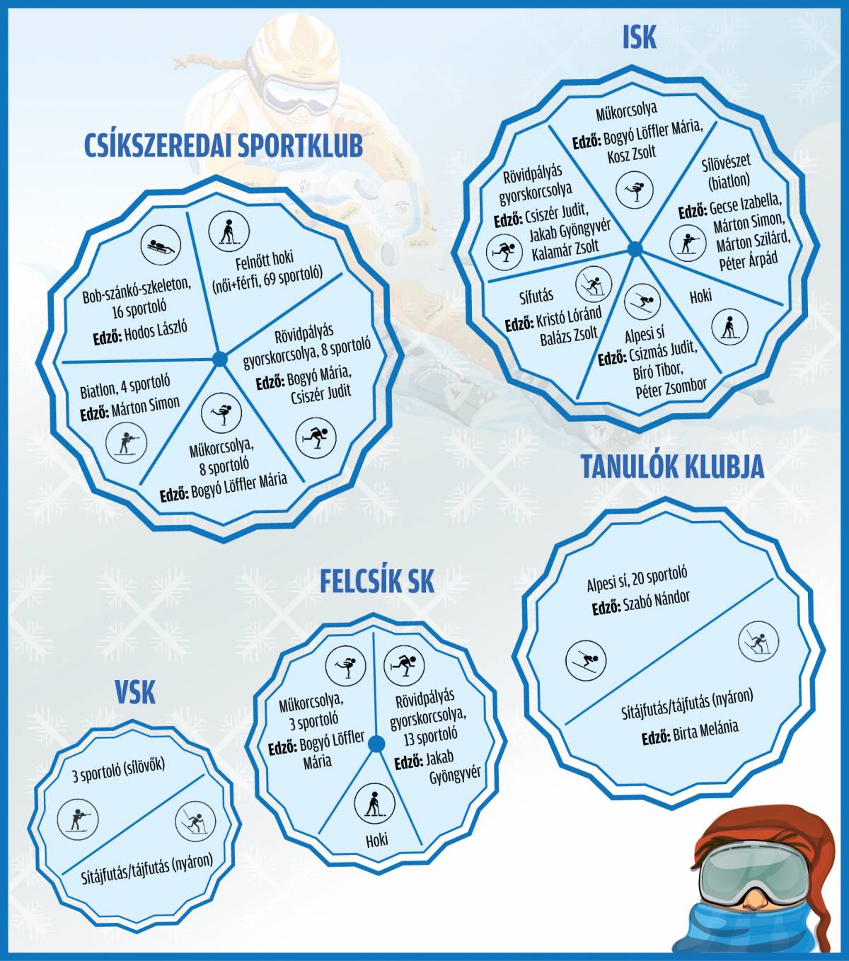 Az igazgató arról számolt be, hogy a Csíkszeredai ISK-nál hat téli sportszakág működik, ebből ötöt említünk most, mivel nemrég külön foglalkoztunk a jégkoronggal: műkorcsolya, rövidpályás gyorskorcsolya, alpesi sí, sílövészet (biatlon), valamint sífutás. Mindegyik ágazatban a sportolók gyerek, kadét valamint ifjúsági kategóriákban szerepelnek. A műkorcsolya szakosztályban Bogyó Löffler Mária, valamint Kosz Zsolt, míg a rövidpályás gyorskorcsolyában Csiszér Judit, Jakab Gyöngyvér, valamint Kalamár Zsolt oktatják a gyerekeket. A sísporton belül is több edző foglalkozik a fiatalok felkészítésével. Az alpesí sí szakágon belül Csizmás Judit, Bíró Tibor és Péter Zsombor vezetik be a lesiklás rejtelmeibe a sportolókat. A sílövészet fiataljait Gecse Izabella, Márton Simon, Márton Szilárd, valamint Péter Árpád edzik. A sífutás két trénere Kristó Loránd és Balázs Zsolt.
