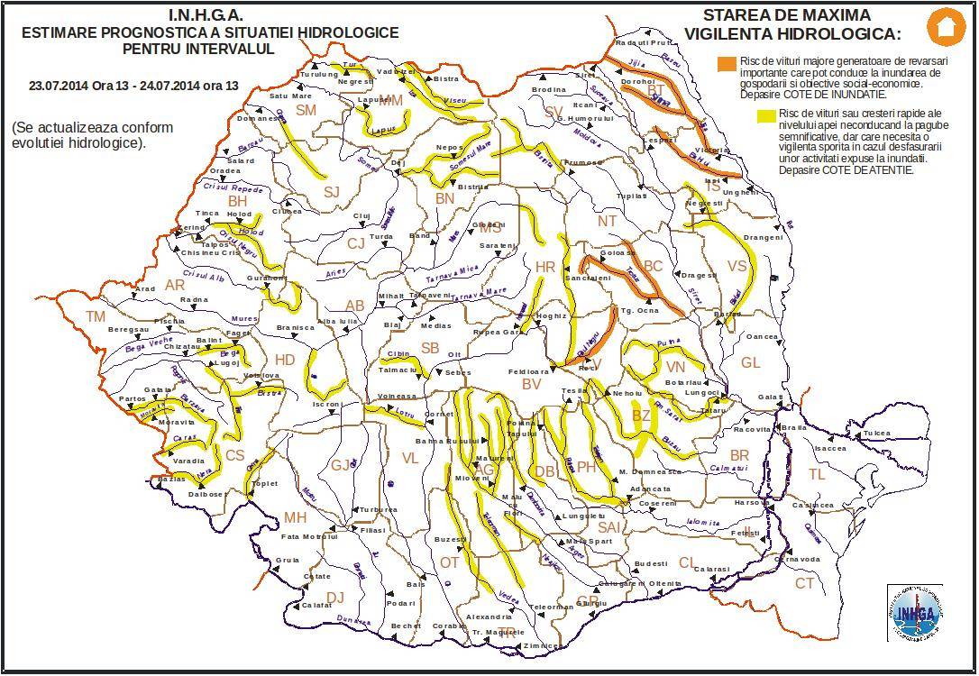 A hidrológiai intézet tájékoztatása szerint az említett időszakban az esőzések nyomán a hegyoldalakon vízfolyások alakulhatnak ki, a kisebb patakokon gyors vízszintemelkedés következhet be, ami árhullámok, áradás kialakulásához vezethet, a nagyobb folyókon pedig szintén megnövekszik a vízmennyiség. A vízszint elérheti a figyelmeztetési és az áradási szinteket. Hargita megye területén a Maros felső szakaszára, az Olt felső szakaszára és mellékfolyóira vonatkozik a sárga színű riasztás. Az egy fokkal veszélyesebb jelenségekre figyelmeztető narancssárga riasztást a Tatrosra és mellékfolyóira adták ki.