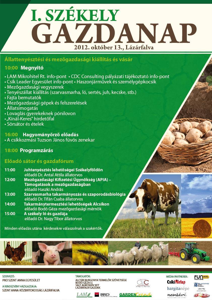 A Pro Szent Anna Egyesület ügyvezetője kifejtette: a rendezvényt – melynek főtámogatója a lázárfalvi közbirtokosság – hagyományteremtő szándékkal szervezik, kimondottan a székelyföldi gazdáknak, akik számos előadást is meghallgathatnak az erre a célra felállított sátorban, ahol gazdafórumra is sor kerül. Többek között Antal Attila állatorvos a Juhtenyésztés lehetőségei Székelyföldön, Tifán Csaba állatorvos a Szarvasmarha takarmányozás és szaporodásbiológia, Nagy Tibor állatorvos a Székely ló és gazdája címmel tart előadást. Az előadássorozat szombaton 11 órától kezdődik. Információs pontok is lesznek felállítva, ahol pályázati tanácsokat igényelhetnek az illetékes cégektől.