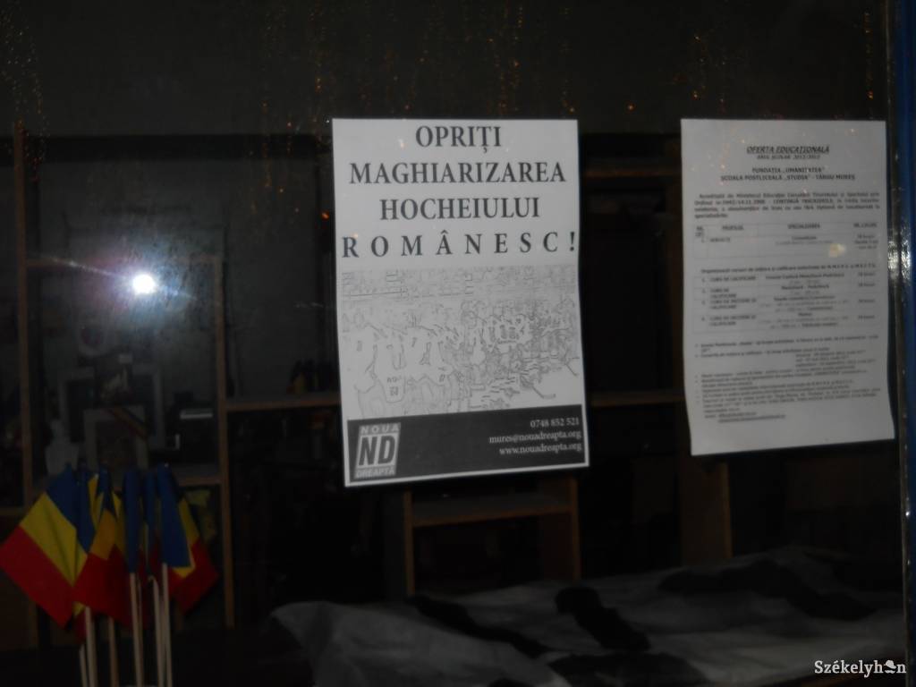 A napokban új falragaszok jelentek meg a Vatra Românească marosvásárhelyi székházának ablakain, amelyeken az Új Jobboldal szélsőséges szervezet arra kéri a lakosságot, hogy „állítsák meg a román hoki elmagyarosítását!”