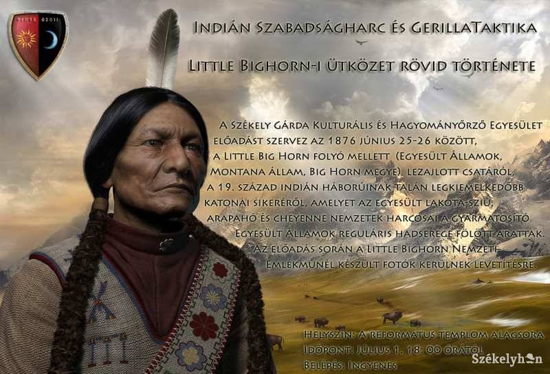 A Székely Gárda Kulturális és Hagyományőrző Egyesület a csíkszeredai református templom alagsorában július 1-jén 18 órától előadást szervez az 1876. június 25-én és 26-án a Little Bighorn folyó mellett (Amerikai Egyesült Államok, Montana Állam, Big Horn megye) lezajlott csatáról, a 19. század indián háborúinak talán legkiemelkedőbb katonai sikeréről, amelyet az egyesült lakota sziú, arapahó és csejenne nemzetek harcosai a gyarmatosító AEÁ reguláris hadserege fölött arattak. Az előadás során a Little Bighorn nemzeti emlékműnél készült fotók kerülnek levetítésre.