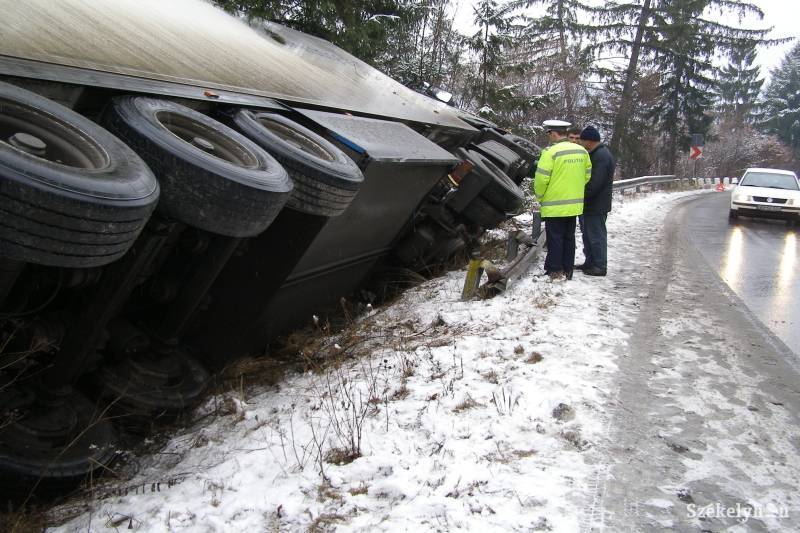 A Cekend-tetőről leereszkedő kamion vezetője Homoródfürdő előtt egy jobbkanyarban nem tudta gépjárművét a haladási sávon tartani, áttért a szemközti irány sávjára, majd az árokba borult. A teherautó vezetője, a 40 éves tordai M. D. honlapunknak elmondta, hogy éjszaka havazott, az út nem volt letakarítva, így megcsúszott, és hiába fékezett, besodródott a sáncba. A fél öt körül történt baleset nem követelt személyi sérülést, a kamionban azonban jelentős anyagi kár keletkezett. Mint megtudtuk, üdítő- és alkoholos italokat szállított volna Csíkszeredába.
