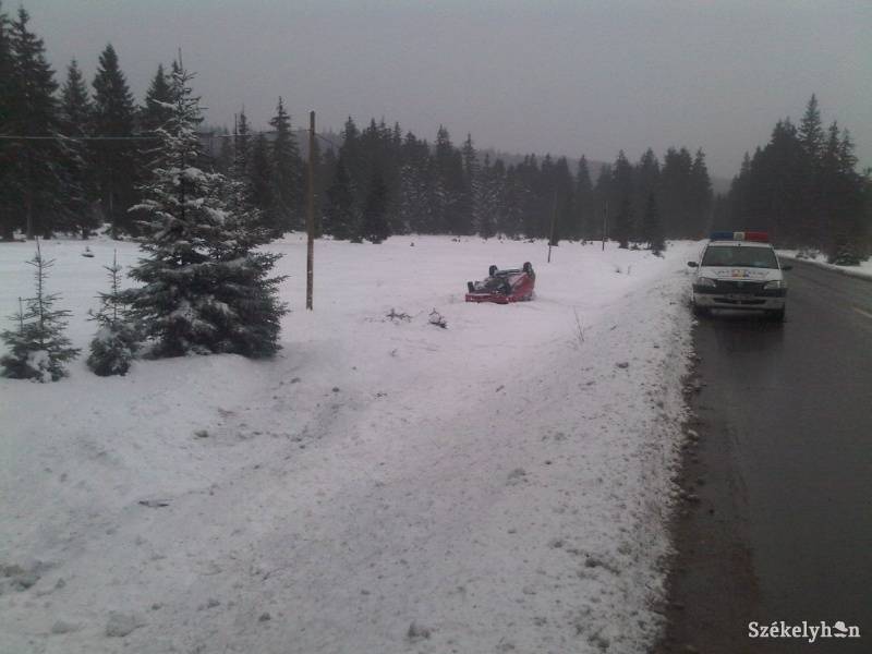 A téliesre fordult időjárás és az óvatlan közlekedés párosának első Hargita megyei autóbalesete történt vasárnap a vékony hóréteg fedte 12C jelzésű országúton – tájékoztat a Hargita Megyei Rendőr-főkapitányság. A Gyergyószentmiklós irányából közlekedő 45 éves marosújvári (Fehér megye) O. D. az útviszonyoknak nem megfelelő sebesség miatt egy kanyarban elvesztette uralmát a járműve irányítása fölött, megpördült, majd az úttestet elhagyva a kocsi a menetiránya szerinti jobb oldali árokba borult.