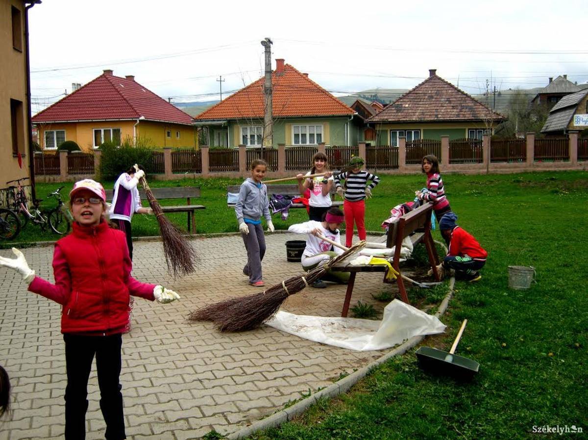 Szőcs Zsuzsa a program támogatóiról is szólt, és egy felhívással is fordul a lakókhoz: „Igyekezetünket, kérésünket figyelembe vette – Bende István közbenjárásával – a Gyergyószentmiklósi Közbirtokosság, 250 lejjel támogatta a programunkat. Továbbá a munkálatokhoz szükséges szerszámokat, kellékeket a Vitalissima Kft., Sándor István biztosította számunkra. A nap végére fánkot kaptunk adományba Szőcs Ágnestől, mindannyiuknak köszönettel tartozunk. Külön köszönet a részt vevő gyerekeknek és annak a négy szülőnek, aki fizikai munkával segítette az akciót. Az elkezdett munkálatnak még nincs vége, a kerítés és a járdaszegély közti részt ugyan kitakarítottuk, de nem jutott elég fakéreg a feltöltéshez. Ezért kérjük azokat a magánszemélyeket és vállalkozókat, akik fakitermeléssel foglalkoznak, hogy 1-2 zsák fakérget adományozzanak nekünk, hogy tudjuk befejezni az árok feltöltését.”