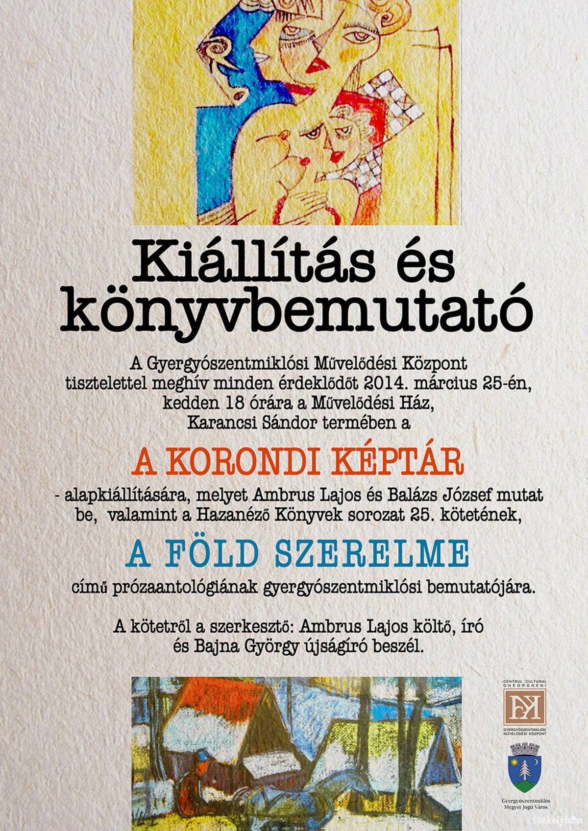 A művelődési ház Karancsi Sándor-termében március 25-én, kedden 18 órától tartják a Korondi képtár alapkiállításának megnyitóját, melyet Ambrus Lajos és Balázs József mutatnak be. A kiállítás-megnyitó keretében ismertetik a Hazanéző Könyvek sorozat 25. kötetét, A Föld szerelme című prózaantológiát. A kötetről a szerkesztő, Ambrus Lajos költő, író és Bajna György újságíró beszél.