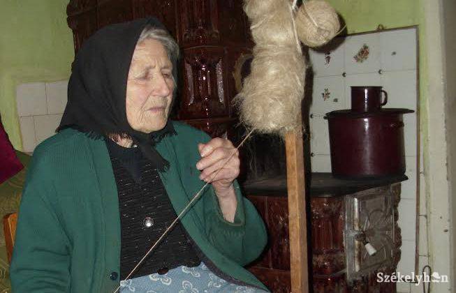 A szobába is beinvitál, képek sokasága, írásosok mindenütt. Tavaly számolta össze, 96 kép volt még a szobában, legutóbb Csíkszeredába vittek belőlük, azok, akik helyben, saját udvarán eskették fel a magyar állampolgárság megszerzéséhez. Lent képek sorjáznak, de a mennyezet is ki van pingálva, nem is akárhogyan, a sarkakban, a csillár körül apró színes minták díszítik. Ha nyár lenne, most is festenék – mondja a két unoka nagymamája, öt dédunoka dédanyja. Úgy tűnik, fog is festeni, de addig is éjjel álmában kötelet ver, nappal pedig néha előveszi a lent, a fonnivalóját, és pörgeti az orsót. Amint mondja, aztán a guzsalyt, a mattolát is odaadja azoknak, akik kérték, akárcsak a többi régi tárgyat.
