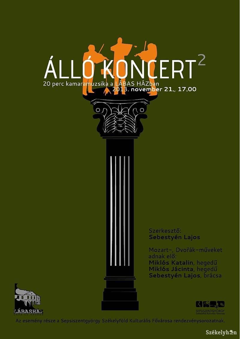 Másodszor szerveznek álló koncertet Sepsiszentgyörgyön. A műfaji átjárhatóság jegyében nem konvencionális helyzetekben zajlanak az álló koncertek, amelyeknek során mintegy húsz percnyi kamaramuzsikát hallgathatnak meg az érdeklődők.