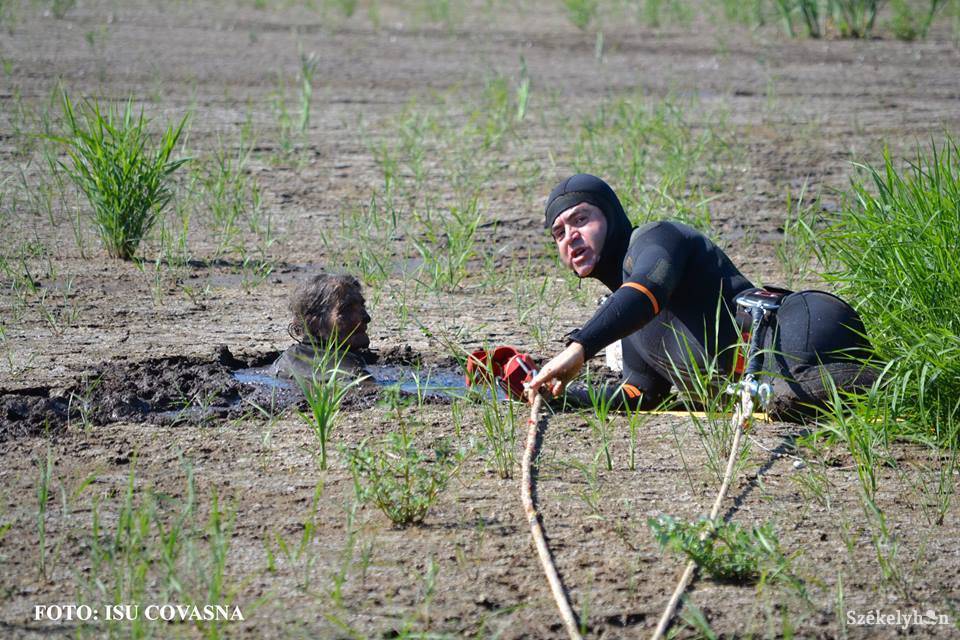 A parttól negyven méterre süllyedt nyakig az idős hölgy Nagyborosnyó közelében, segélykiáltásait hétfő reggel hallották meg a helybéliek, akik a 112-es segélyhívószámon 9 órakor jelentették be az esetet – tájékoztatott Tolvaj Marius, a Kovászna Megyei Készenléti Felügyelőség szóvivője, aki hozzátette: a riasztás pillanatától számítva versenyfutás kezdődött az idővel, mivel a 80 éves nő az elmerülés lehetősége miatt folyamatos életveszélyben volt. A helyszínre különleges mentőjárművekkel érkeztek ki a kovásznai tűzoltók, majd egy kötelekkel társaihoz biztosított búvár segített az asszonyon: egy hordágyra feküdt, megközelítette és kiemelte a nőt a mocsárból, majd parton lévő kollégái húzták ki őket.