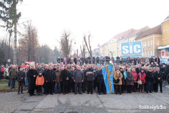 Sokan székely és magyar zászlókkal, valamint gyászlobogóval érkeztek a tiltakozássorozat keddi eseményére, ahol versszavalat, valamint imádság mellett ismét ötször énekelte el a háromszáz fős tömeg a magyar himnuszt Marius Popica kormánymegbízott irodájának ablaka alatt.