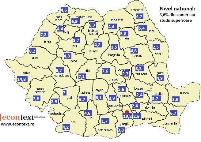 Ebben a tekintetben, a legjobb helyzetben Teleorman van, bár munkanélküliből nincs hiány ott sem, a 15.913 munkanélkülire csupán 278 diplomás jut, vagyis 1,7 százalék.