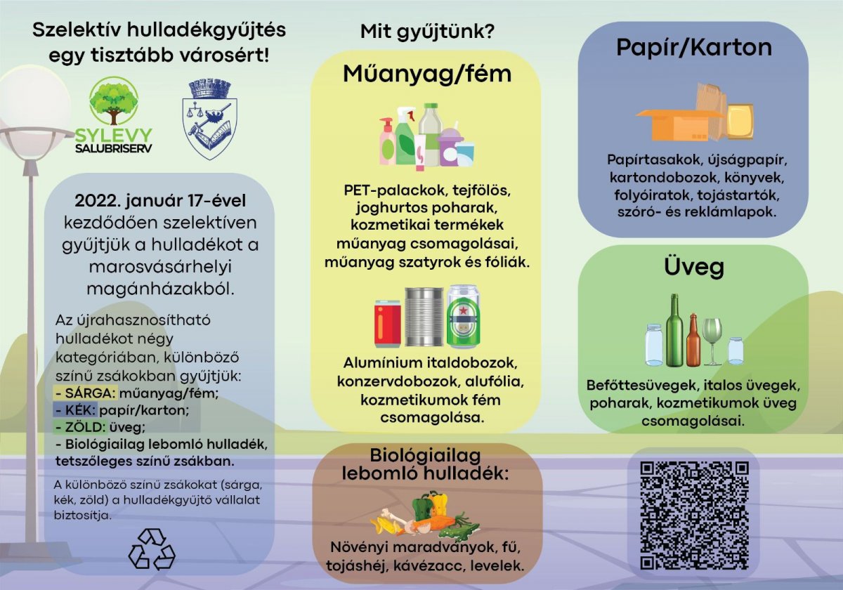 A szelektív hulladékgyűjtés megszervezése és kivitelezése összetett folyamat, és ahhoz, hogy ez sikeres legyen, szükség van a lakosság és az önkormányzat szoros együttműködésére. A szelektív hulladékgyűjtés hosszútávon a szolgáltatás árának mérséklését eredményezheti, tonnánként akár 175 lejjel csökkenhetnek a tárolási költségek. Részletek a polgármesteri hivatal honlapján.