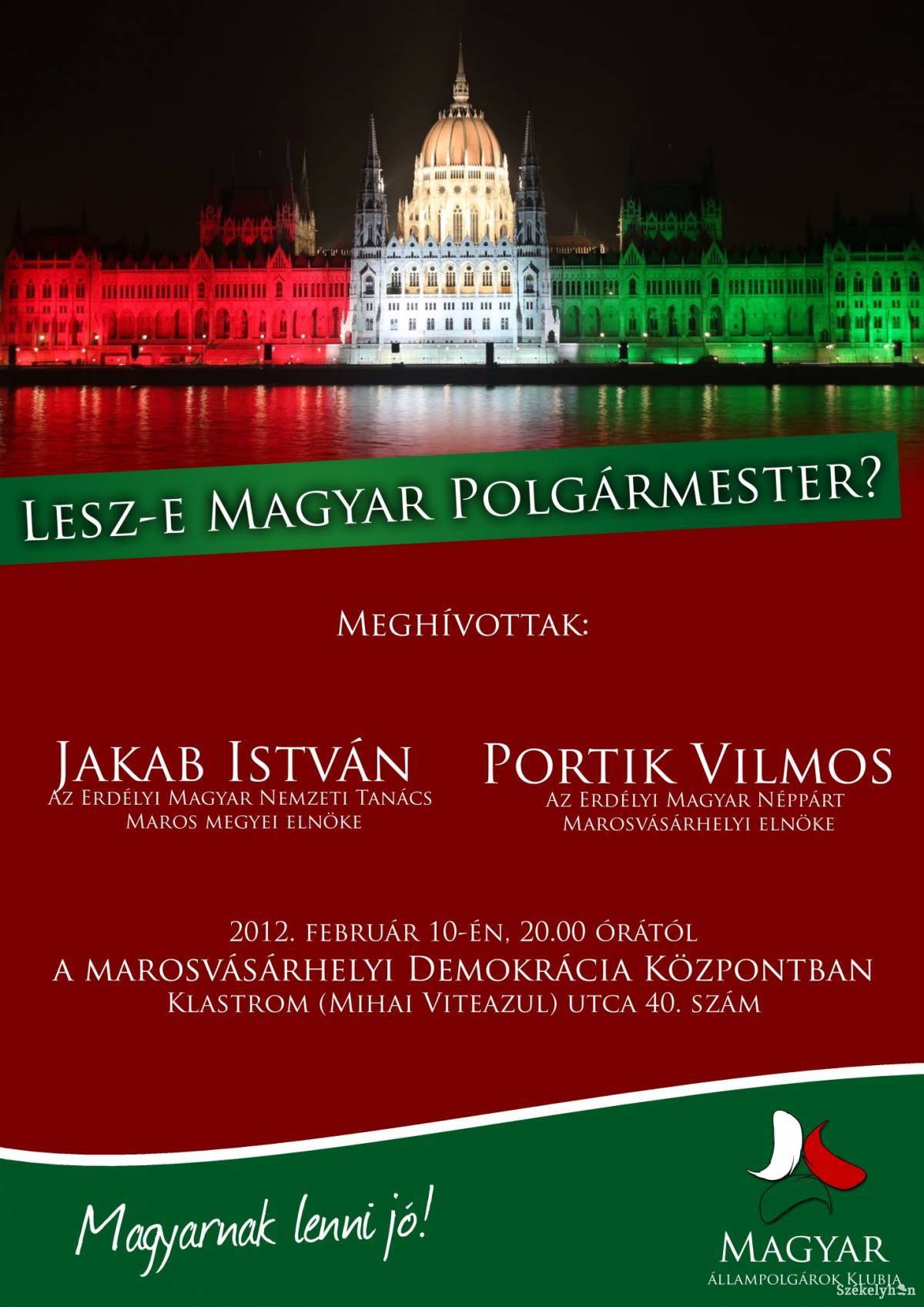 A nyitott rendezvényre február 10-én, pénteken 20 órától kerül sor a Klastrom (Mihai Viteazul) utca 40. szám alatti demokráciaközpontban. Meghívottak: Jakab István, az EMNT Maros megyei szervezetének elnöke, valamint Portik Vilmos, az Erdélyi Magyar Néppárt marosvásárhelyi szervezetének elnöke.