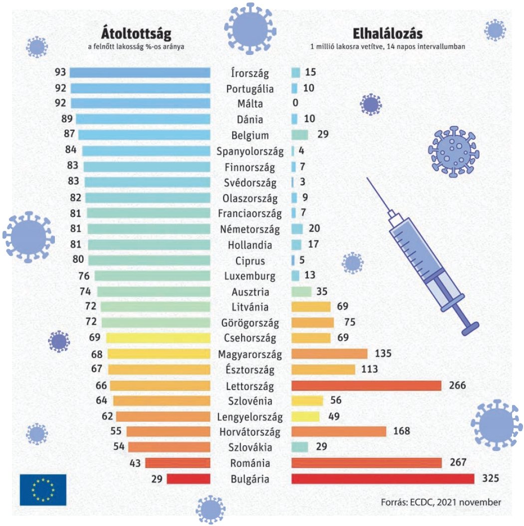 Románia a második helyen áll abban az EU-s statisztikában, amely az átoltottsági ráta és a Covid-elhalálozási adatok közti összefüggésre mutat rá. Az Európai Betegségmegelőzési és Járványvédelmi Központ (ECDC) adatai alapján az Európai Bizottság közzétett egy grafikont, amely a 27 EU-tagország átoltottsági, és lakosságarányos elhalálozási adatait mutatja be. Ezen Románia az utolsó előtti helyen áll a második legalacsonyabb átoltottsági aránnyal (43%) és a második legmagasabb halálozási rátával (267/1 millió/14 nap, azaz 267 haláleset jutott egymillió lakosra az elmúlt 14 napban). Ennél rosszabb adatai csak Bulgáriának vannak EU-szerte. Az élen álló országokban 90 százalék fölötti az átoltottság aránya a felnőtt lakosság körében, és olyan is van köztük (Málta), ahol egy Covid-haláleset sem történt az elmúlt két hétben.