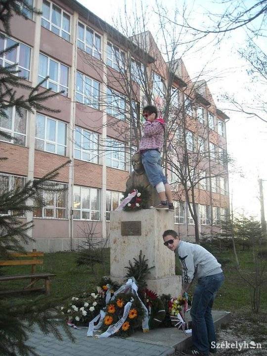 A Facebookon terjengett egy, éppen a közösségi portálra feltöltött felvétel, amelyen az Octavian Goga Nemzeti Kollégium egyik évfolyamának jelenlegi vagy volt tagja és társa a csíkszeredai Nagy Imre Általános Iskola előtti mellszoborral szórakozik, egyikük a szobor talapzatára felmászva, altestével a szobor fejének támaszkodik, míg a másikuk a kihelyezett koszorúk egyikén a piros-fehér-zöld szalaggal foglalkozik. A felvételről és az alatta található hozzászólásokról több jelzés érkezett a keddi nap folyamán a Székelyhon.ro szerkesztőségéhez, s délutánra a felvétel eltűnt a szóban forgó fiatal Facebook-profiljáról. A közösségi portál egyik felhasználója érdeklődésünkre elmondta, a nap folyamán sokan jelezték a portál központjának a felvétel sértő jellegét, talán ezzel is magyarázható a kép eltűnése. Többen viszont előtte mentést készítettek a képernyőjükről, és a sértő fotót is lementették, s ezeket eljuttatták szerkesztőségünkbe.