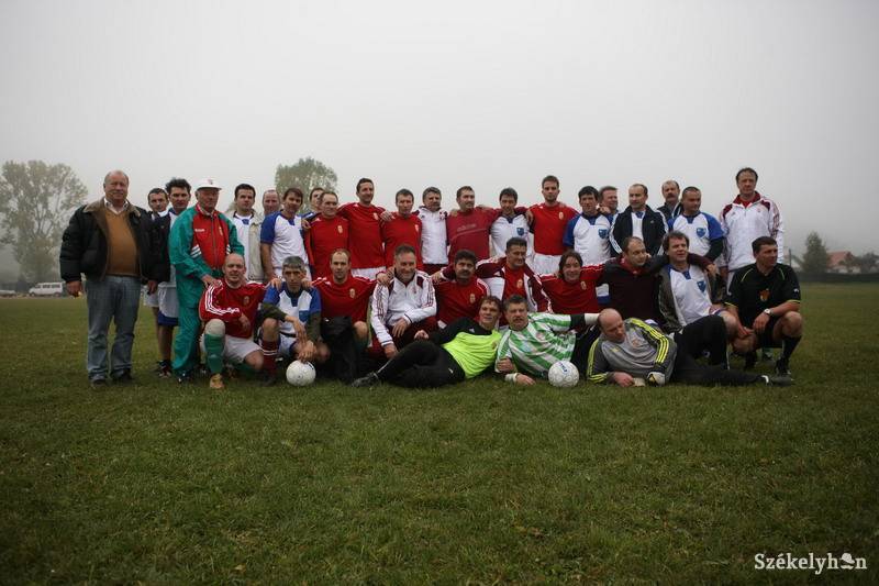 A felvételen a magyar parlament és székelyföldi közméltóságok csapatának tagjai láthatók, középen Kövér László, baloldalon Buzánszky Jenő, az Aranycsapat legendás tagja, az NGYSZ Sportbizottságának elnöke és dr. Edvi Péter, az NGYSZ elnöke.