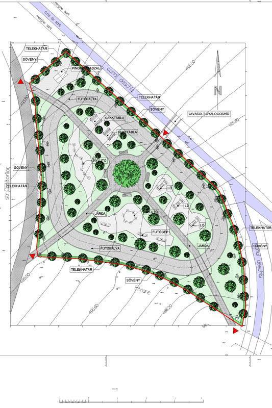 Érdekes munkának és kihívásnak tűnt – mondta el Ferenczy Zsolt műépítész, a képen látható tervrajz készítője. Javaslata szerint egy híddal kötné össze a játszóteret a Lakatos István utcával, az utcák metszéspontjába helyezné a sporttelep „központját”. A pályán végighúzódó két út négy részre osztaná a telepet, ide kerülnének a tervezett szabadtéri erőgépek.