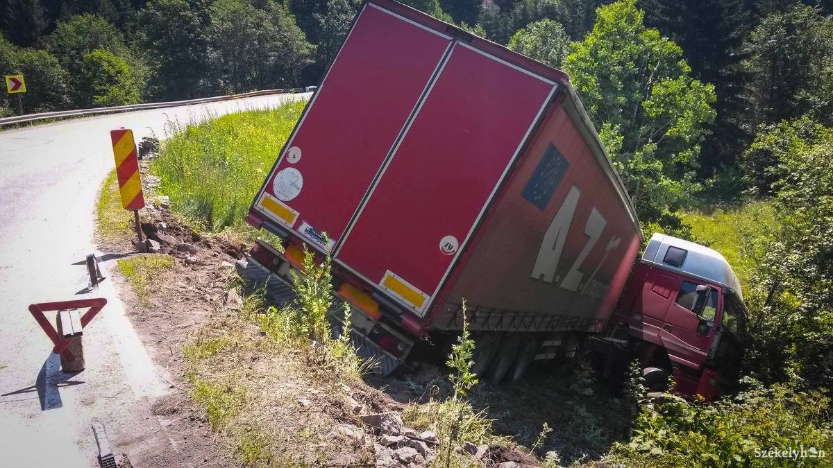 A Csíkszereda irányába tartó nyerges vontató néhány kilométerrel Szentegyháza után, egy éles kanyarban hajtott le az úttestről a menetiránya szerinti jobb oldalon szombaton hajnalban. A tehergépkocsi a meredek oldalon, pár kisebb fa között állt meg.