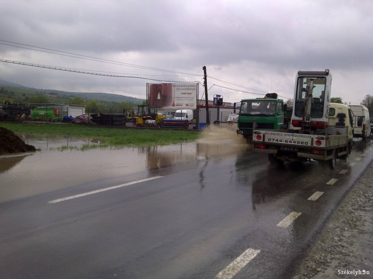 Nagy mennyiségű felgyűlt esővíz akadályozta a közlekedést csütörtök reggel a Fenyéd és Udvarhely közötti országúton.
