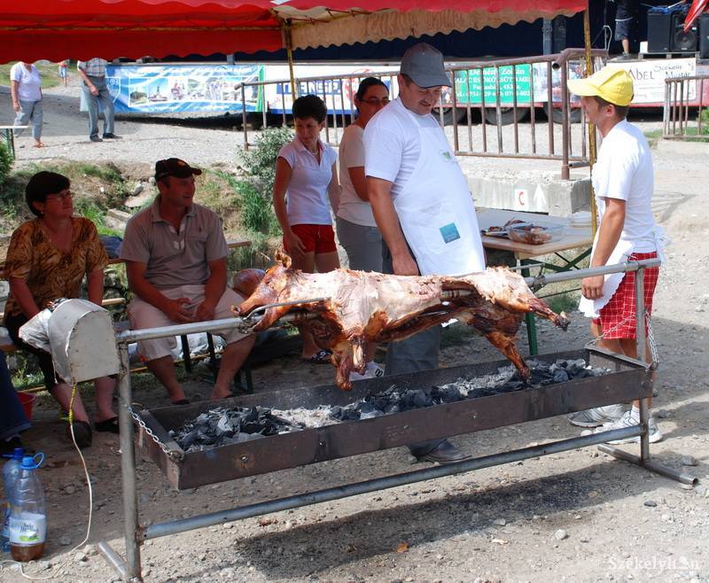Nem volt nehéz megtalálni. Még annak sem, aki életében először járt Kecsetben. Farkaslakáról kijövet, a főútról való letéréskor az út felett egy hatalmas banner jelezte, hogy jó irányba indultunk. A faluba beérve sem kellett fülelni, hogy honnan jön a hang, ahogy közeledtünk a központhoz már fel is tűntek a sátrak. Az elsők között, vagy inkább alatt Bálint Sándor zsindelykészítő, teknővájó kézügyességét csodálhattuk meg, kicsit arrébb házi sajtot kínáltak eladásra, aztán feltűnt valami, ami nem biztos, hogy epekedve várta a falunapokat, tekintettel arra, hogy egy nappal korábban még szabadon röföghetett, de a faluünnep nyitónapjának nagy részét többnyire egy nyársra feltűzve töltötte. Józsa Imre locsolgatott páclével egy malacot, amelyről – bár nem kóstoltuk meg – feltételeztük, hogy bizony jóízűre sikeredhetett, mert már igencsak fogytában volt.