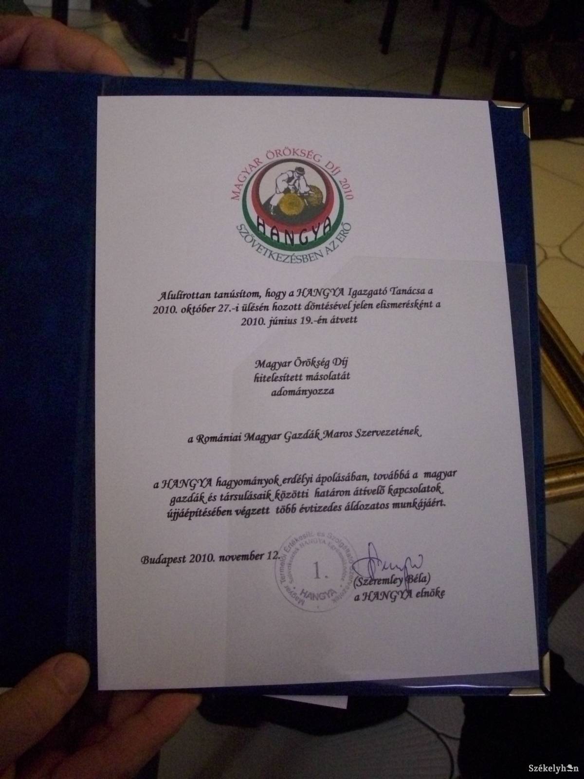A marosvásárhelyi székhelyű Romániai Magyar Gazdák Egyesülete Maros szervezet (RMGE–MAROS) küldöttségének tagjai pénteken Budapesten, a Benczúr Hotelben átvették a Hangya Szövetkezeti Együttműködés (Hangya) elnökétől és ügyvezető titkárától a Magyar Örökség Díj 2010 hitelesített másolatát, majd együttműködési keretmegállapodást írtak alá a Hangyával.