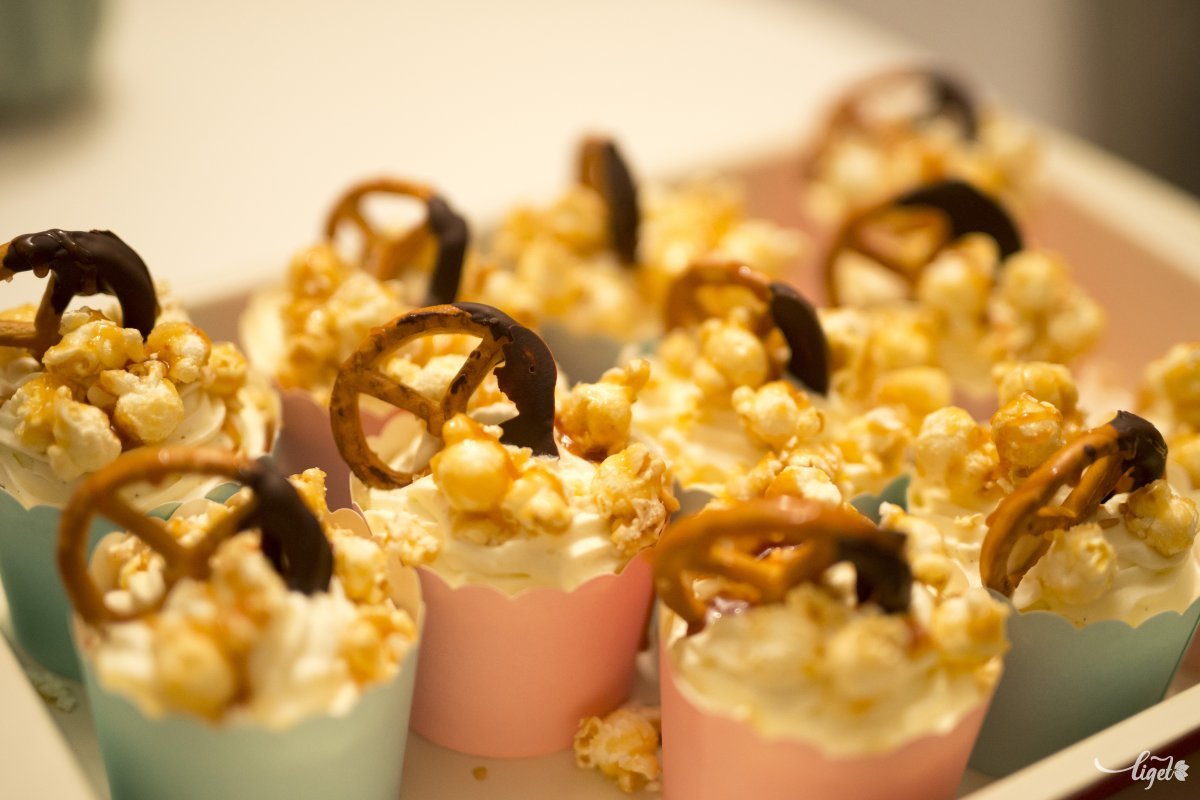 Hozzávalók a muffinhoz: 225 g vaj, 400 g cukor, 4 tojás, 250 g liszt, 1 tk. vanília, 2 tk. sütőpor, 220 ml tej. A krémhez: 300 g tejszín, 150 g krémsajt, 70 g porcukor, vanília. A díszítéshez: karamelles popcorn, pici sós perec (ropi), sós mogyoró, fekete csoki.