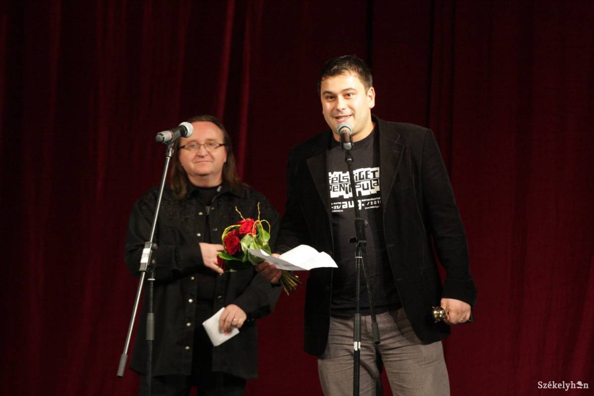 A díjat átadó Mike Godoroja (balra) és az átvevő, Balázsi-Pál Előd (jobbra), a fesztivál kommunikációs igazgatója