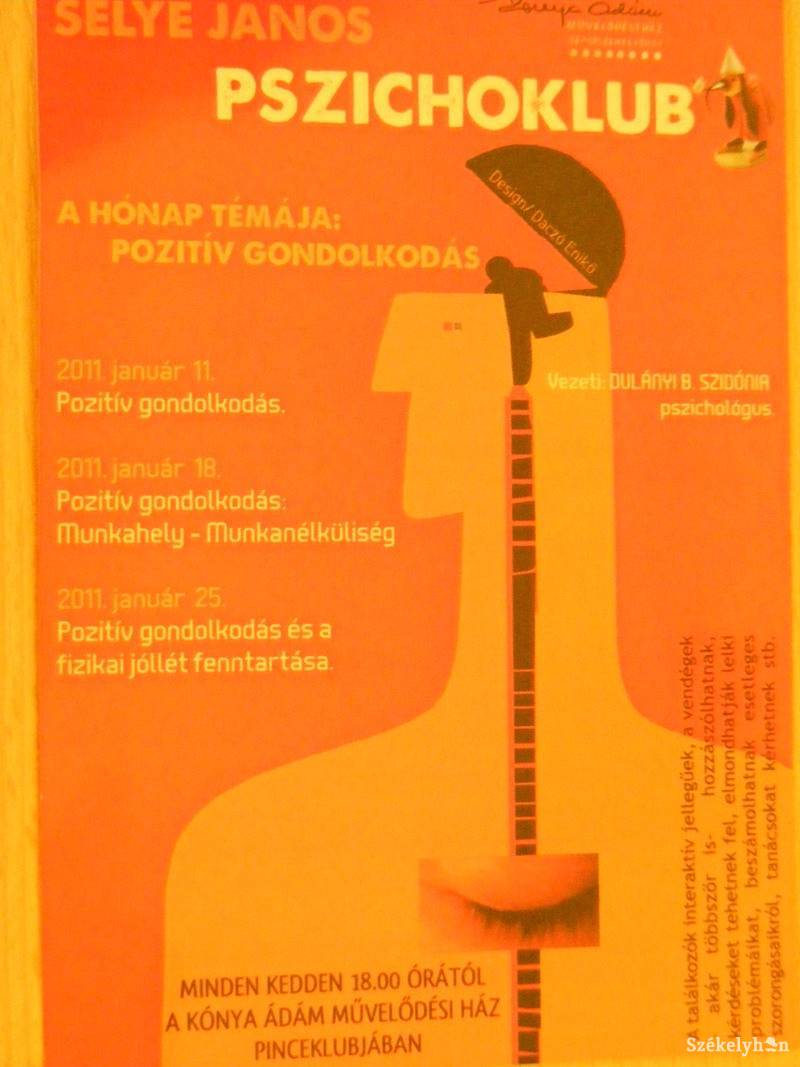 Ha figyelünk magunkra, képesek leszünk pozitívan látni környezetünket, ugyanakkor alapvető agyi parancsokkal sikeresek lehetnek mindennapjaink is – vélik a pozitív gondolkodás alkalmazói. Ám bármennyire is igyekszik valaki a jó dolgokra koncentrálni, néha elkerülhetetlen a rossz anyagi helyzet vagy a munkanélküliség, ami megmérgezi mindennapainkat. Erre a problémára segít megoldást találni Dulányi B. Szidónia pszichológus, a Selye János klub vezetője, így ebben a hónapban a pozitív gondolkodásmódról beszélgetnek a klubtagok.