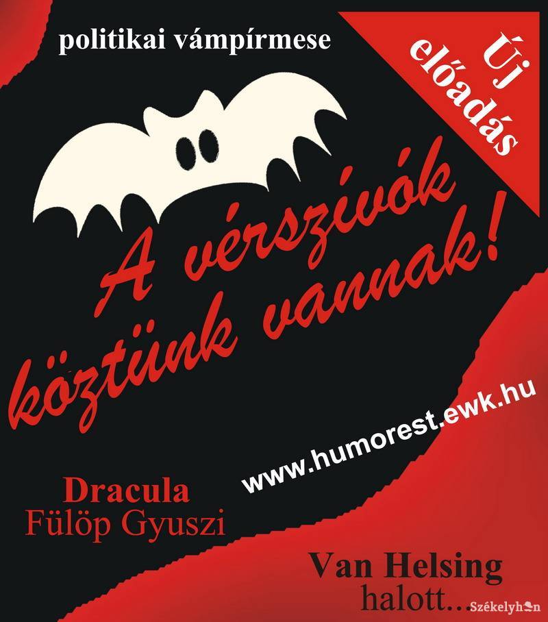 De eljött a pillanat, amikor bosszút állhatunk Drakula gróf segítségével. 2011. március 27-én este 7 órától a sepsiszentgyörgyi Kónya Ádám Művelődési Házban egy igazi vérszívó áll bosszút korunk nagy vérszívóin egy politikai vámpírmesével. Jegyeket rendelni a 0721-462 127-es vagy a 0788-758 742-es telefonszámon lehet. A belépő ára 10 lej.
