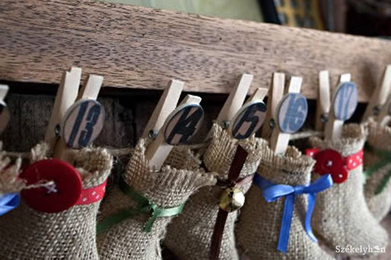 Egy tetszőleges méretű kartonlapot bevonunk piros, vagy valami egyéb karácsonyi hangulatú anyaggal, amelyre előzőleg 24 kis zsebet varrtunk, s ráírtuk mindegyikre egyenként a napok számát. Ajándékainkat ezekbe rejthetjük.