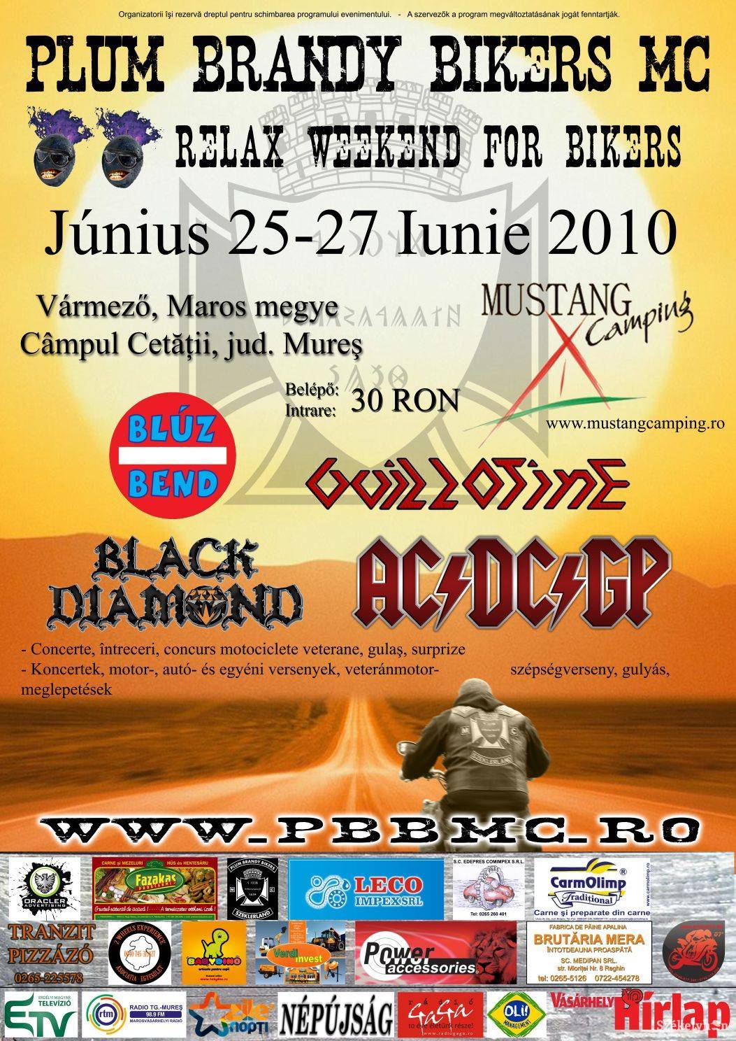 „Szeretettel várunk kicsiket és nagyokat, motorosokat és nem motorosokat a vármezői Mustang kempingben zajló, nagyszerű hangulatú, hétvégi laza partira, amelyről értékes ajándékokkal térhetnek haza a számos poénos verseny nyertesei. Székelyföldön családias hangulatú, old-school típusú találkozókat szervezünk, így a mostani is ilyen lesz” – mondta Nagy Botond. Hozzátette, Romániában Kolozsváron, Ploieşti-en, Bákóban, Predeálon, Bukarestben, Temesváron, Szatmárnémetiben szerveznek „kommersz bulikat”, ezzel szemben a székelyudvarhelyi (amely augusztusban lesz), a homoródi, a csíkszeredai, a baróti rendezvények meghittebb hangúlatúak, szűkebb környezetben zajlanak. A szűkebb ebben az esetben 500 személyt jelent, legalább ennyire számítanak ugyanis a szervezők, akik bőséges enni- és innivalóval, számos vetélkedővel, koncertekkel és hajnalig tartó mulatozással várják a vendégeket. Fellép a Blúz Bend, a Guillotine, a Black Diamond és a magyarországi AC/DC/GP zenekar. Beugró két napra: 30 lej, részletek a www.pbbmc.ro honlapon.