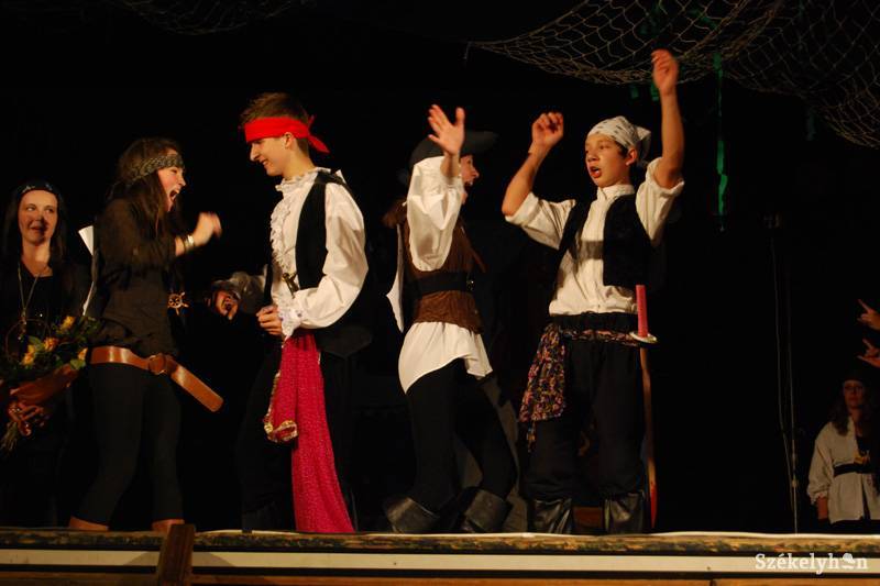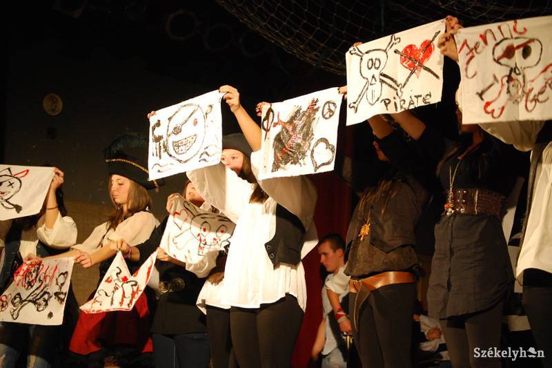 Sok kalóz kis helyen – ez volt a jellemző a Baczkamadarasi Kis Gergely Református Kollégium péntek esti gólyabáljára. A két kilencedik osztály teljes létszámmal képviseltette magát a színpadon, legalábbis az első körben, majd hulltak a fejek, ahogy kalóz harcosokhoz illik.