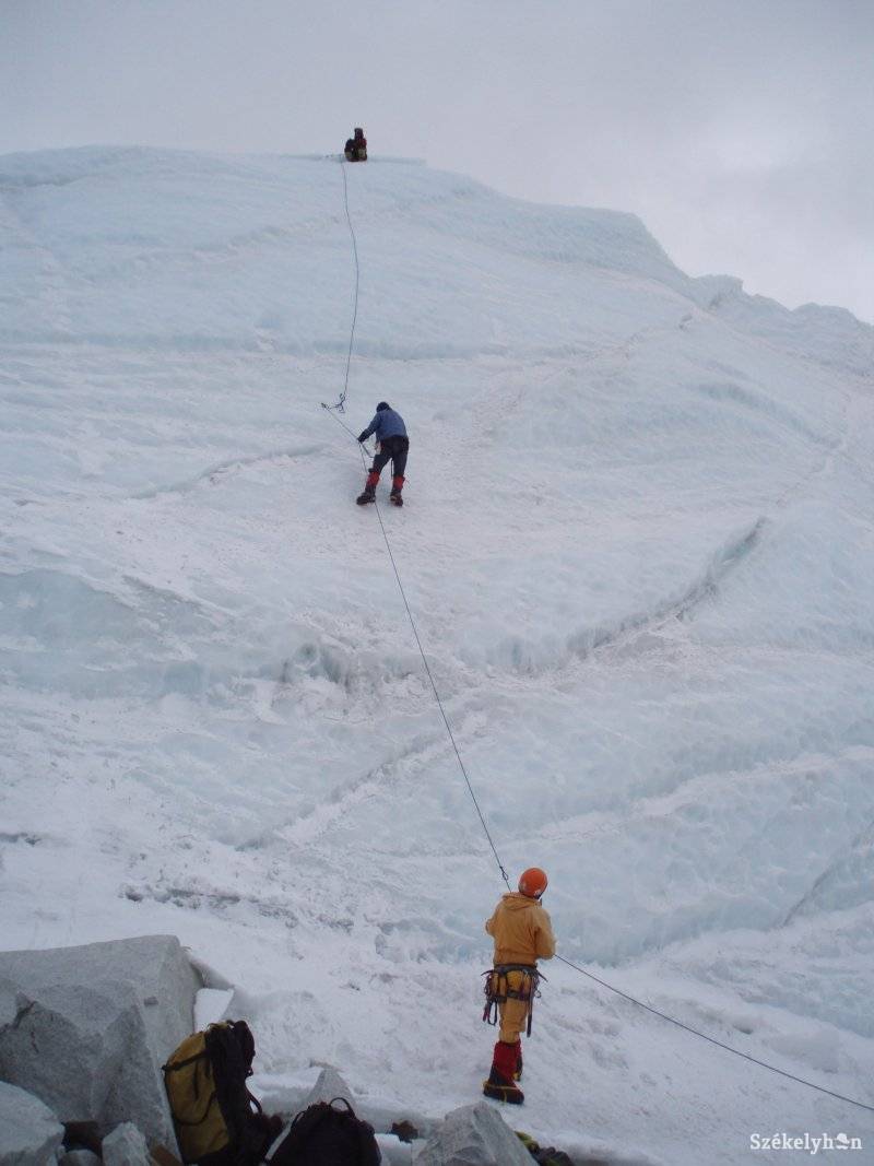 Május 4-én az akklimatizációs gyalogtúrán kívül jégfalmászással edzettek, ami tulajdonképpen előkészület az egy kötélen indulók jégfalmászási technikájának összehangolására.