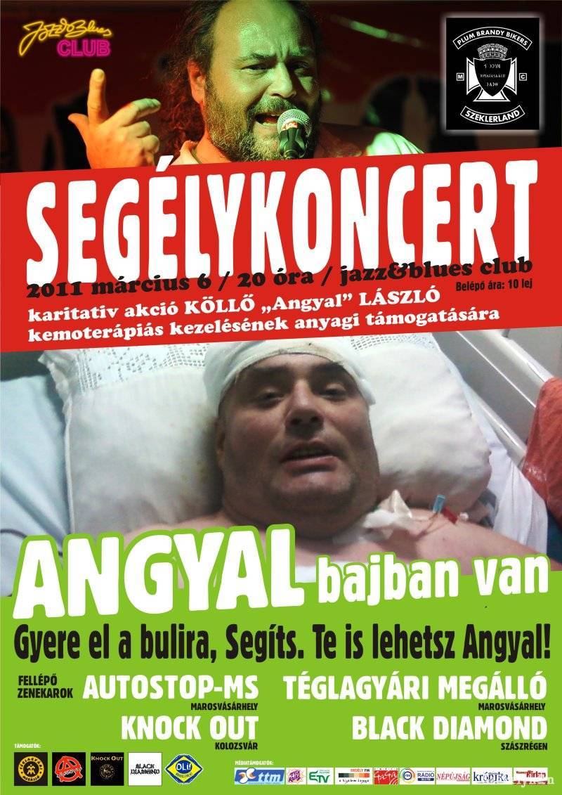 Betegsége kezelési költségeinek, a gyógyszerek, a kemoterápia, a sugarazás ellenértékének előteremtése végett a motoros klub és baráti köre jótékonysági partit szervez a marosvásárhelyi Jazz&Blues Clubban, a Sörház (Sinaia) utca 3. szám alatt március 6-án 20 órától. A koncert teljes bevételével Angyal kezelését segítik, a bulin zenélő Téglagyári Megálló, Autostop MS, Black Diamond, Knock Out együttesek Laciért ingyen vállalták a fellépést!