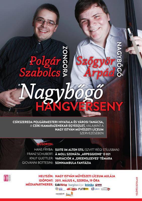 „Ezelőtt három évvel hasonló felállásban volt hangversenyünk Csíkszeredában. Koncertünk lényege, hogy jobban meg lehet ismerni a nagybőgőt mint hangszert, hisz a kamarazenekarokban vagy szimfonikus zenekarokban általában nem kap szóló szerepet. Olyan műveket választottunk, ami a bőgő különlegesebb hangeffektusaira világít rá” – emelte ki portálunknak Szőgyör Árpád. Különben a nagybőgős tavaly végezte a mesteri fokozatot Baselben, ahol – az ottani gyakorlat szerint – nyilvános hangversennyel vizsgázott. Úgy gondolta, hogy itthon is bemutatja a nagyrészt nagybőgőre komponált műveket.