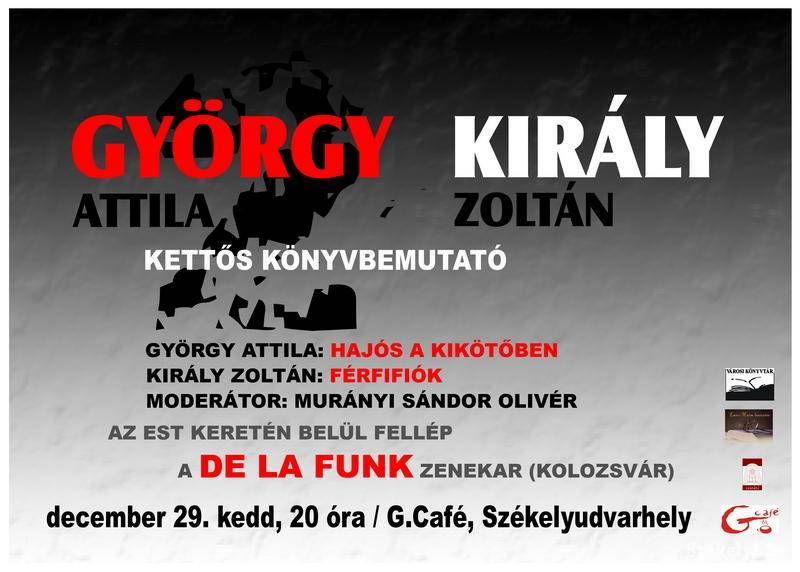 Kedden, december 29-én 20 órától az udvarhelyi G. kávézóban egy költőt, Király Zoltánt és egy írót, György Attilát hallhatják az érdeklődők.