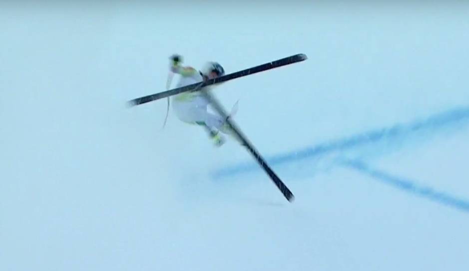 A csíkszeredai születésű magyar sízőnek egy jobb kanyarban szétcsúsztak a lábai, majd nagyot esett, egyik léce ráadásul nem oldott le és a havon csúszva nekisodródott egy kapunak is.