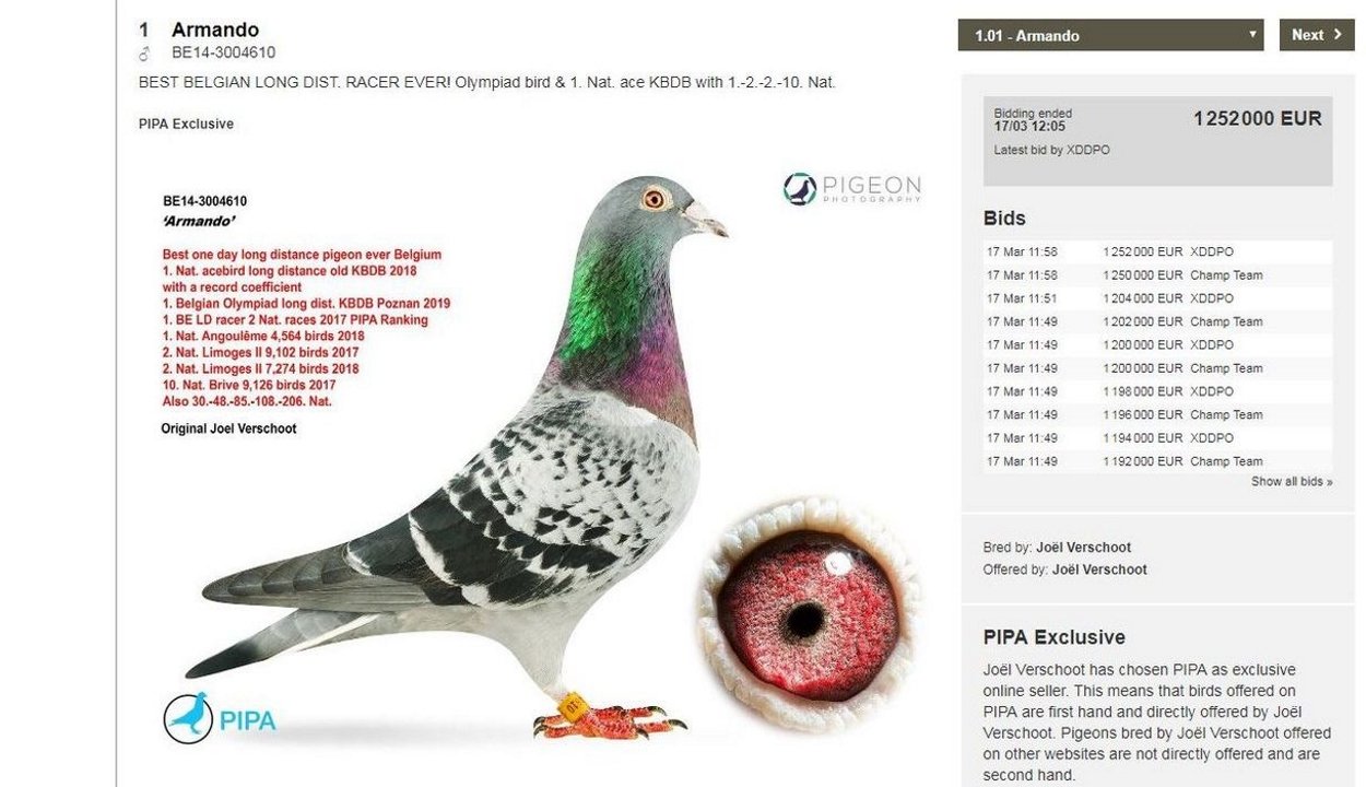 A Pigeon Paradise belga galambász weboldal szerint már a héten kiderült, hogy Armando lesz az árverésen valaha legdrágábban eladott postagalamb, „ám senki sem várta, hogy az ár az egymilliós álomhatárt is meghaladja”.