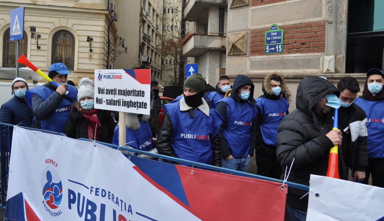Az igazságügyi minisztérium épülete előtt tüntetett szerdán a Publisind szakszervezeti szövetség többtucatnyi képviselője.