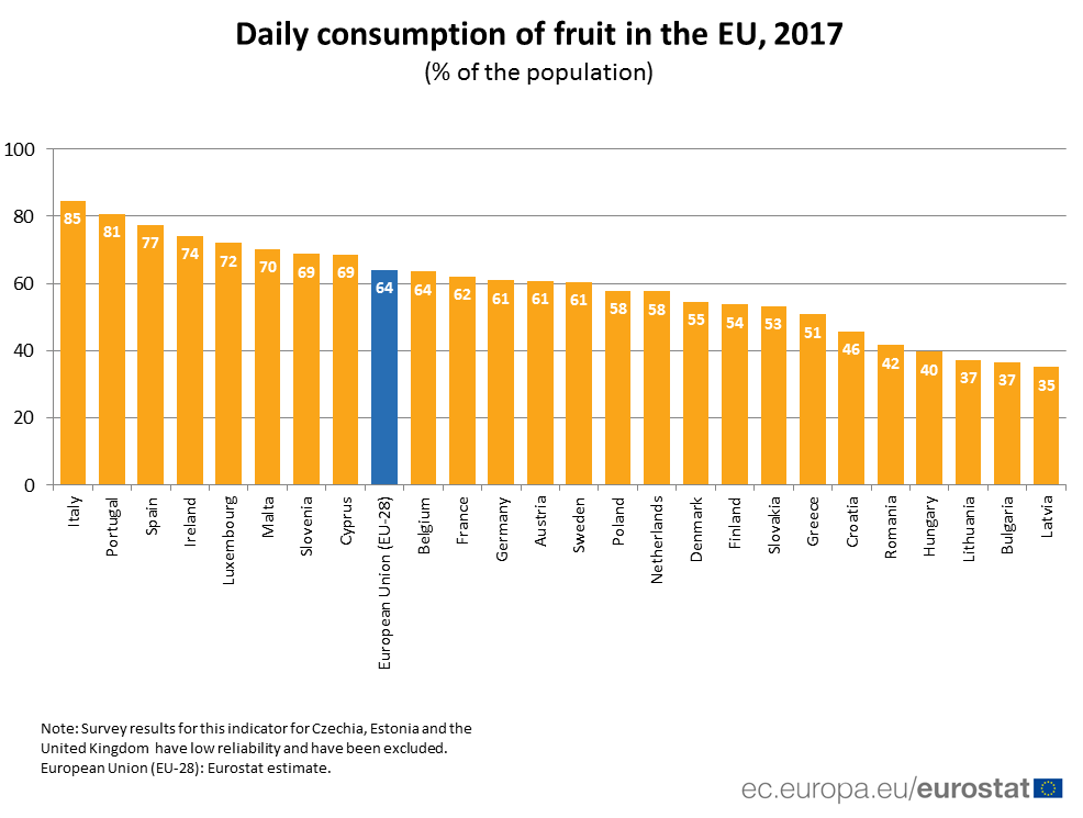 Ebben a tekintetben Olaszország (85%) és Portugália (81%) áll a legjobban, míg a lista másik végén Lettország (35%), Bulgária és Litvánia (37%) található. Magyarország (40%) és Románia (42%) gyümölcsfogyasztás terén hátulról a negyedik, illetve az ötödik helyet foglalja el.