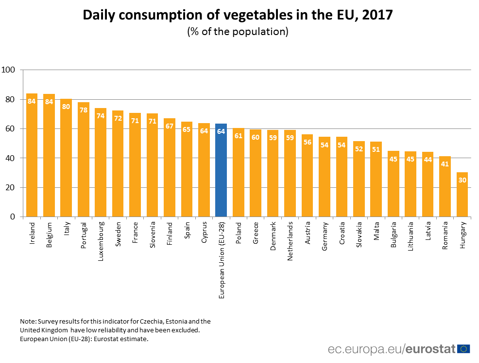 Az Eurostat felmérése szerint 2017-ben az unió lakosainak kevesebb, mint a negyede (23%) fogyasztott legalább naponta kétszer zöldséget. A megkérdezettek 40 százaléka naponta egyszer, 36 százaléka pedig ritkábban vagy egyáltalán nem fogyaszt zöldséget.