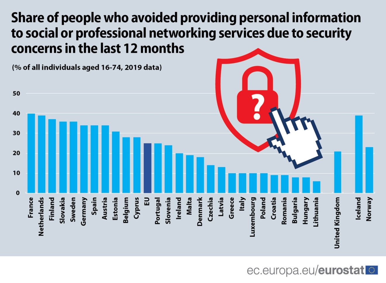 Az Európai Unió (EU) 16 és 74 év közötti állampolgárainak egy negyede állítja azt, hogy 2019-ben biztonsági okok miatt óvakodott megadni személyes adatokat az online szociális térben; a legóvatlanabbnak ezen a téren Litvánia, Bulgária, Magyarország, Horvátország és Románia lakossága bizonyult.