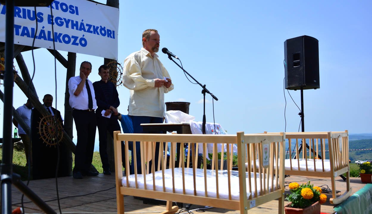 Amikor elmentem Sepsiszentgyörgyre Veres Ferenc fafaragó-asztalosmester műhelyébe, hogy bölcsőt rendeljek, akkor meséltem neki a magyarországi példáról. Ennek hallatán felajánlotta, hogy az általam megrendelt bölcső mellé ad még egyet ajándékba azzal a céllal, hogy a két bölcsővel indítsuk el a vándorbölcső-mozgalmat. Pár hét alatt a két bölcső mellé családtagok, barátok és ismerősök részéről még öt felajánlás született, s így a kápolna búcsús ünnepén hét kismamának tudtunk bölcsőket átadni.
