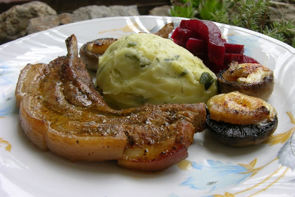 Indultak utána gombafejek is, túróval és szalonnával, ha már lúd (disznó), legyen kövér alapon. A krumplipüré meg az amúgy saját kerti hagymák zöldjével gazdagodott, színben és ízben egyaránt. És, végül egy őszinte, szívből jövő ajánlás (Áprily után, szabadon): fogyasszunk céklát, a virulás vörös varázsát, egészségünk védőbástyájának e fontos őrzőjét. Úgy érzem, fizikai erőnlétem hanyatlásnak indult (a szellemit meg ne firtassuk!), ezért ma tányérra került. Hadd frissüljek!