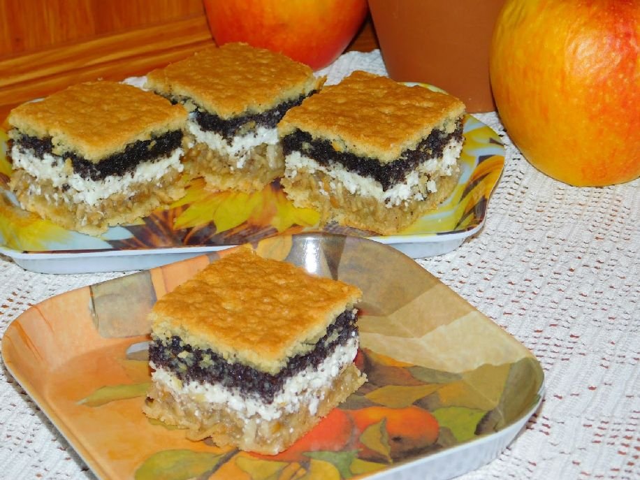 Az almákat megmossuk, lereszeljük, levét kicsavarjuk. Hozzáadjuk a cukrot, grízt, fahéjat, összekeverjük. A túrót áttörjük. Belekerül a tejföl, cukor, pudingpor, gríz, citromhéj. Végül hozzákeverjük a 3 fehérje felvert habját. A mákot elkeverjük a tejjel, cukorral, pudingporral, végül belevegyítjük 3 fehérje felvert habját. A tésztát két részre osztjuk. Mindkettőt tepsiméretűre nyújtjuk. Az elsőt kikent tepsibe tesszük. Elsimítjuk rajta az almát, erre kerül a túrótöltelék, végül a mák. Beborítjuk a másik tésztalappal. 180 fokra előmelegített sütőbe tesszük. Addig sül, míg a tetején szépen megpirul a tészta. (http://gerdisuti.blogspot.ro/)