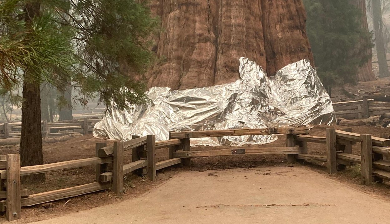 Tűzálló takaróba burkolták a világ legnagyobb fáját, hogy megóvják a kaliforniai tűzvésztől, ami már a Sierra Nevada-i Sequoia Nemzeti Parkot fenyegeti.