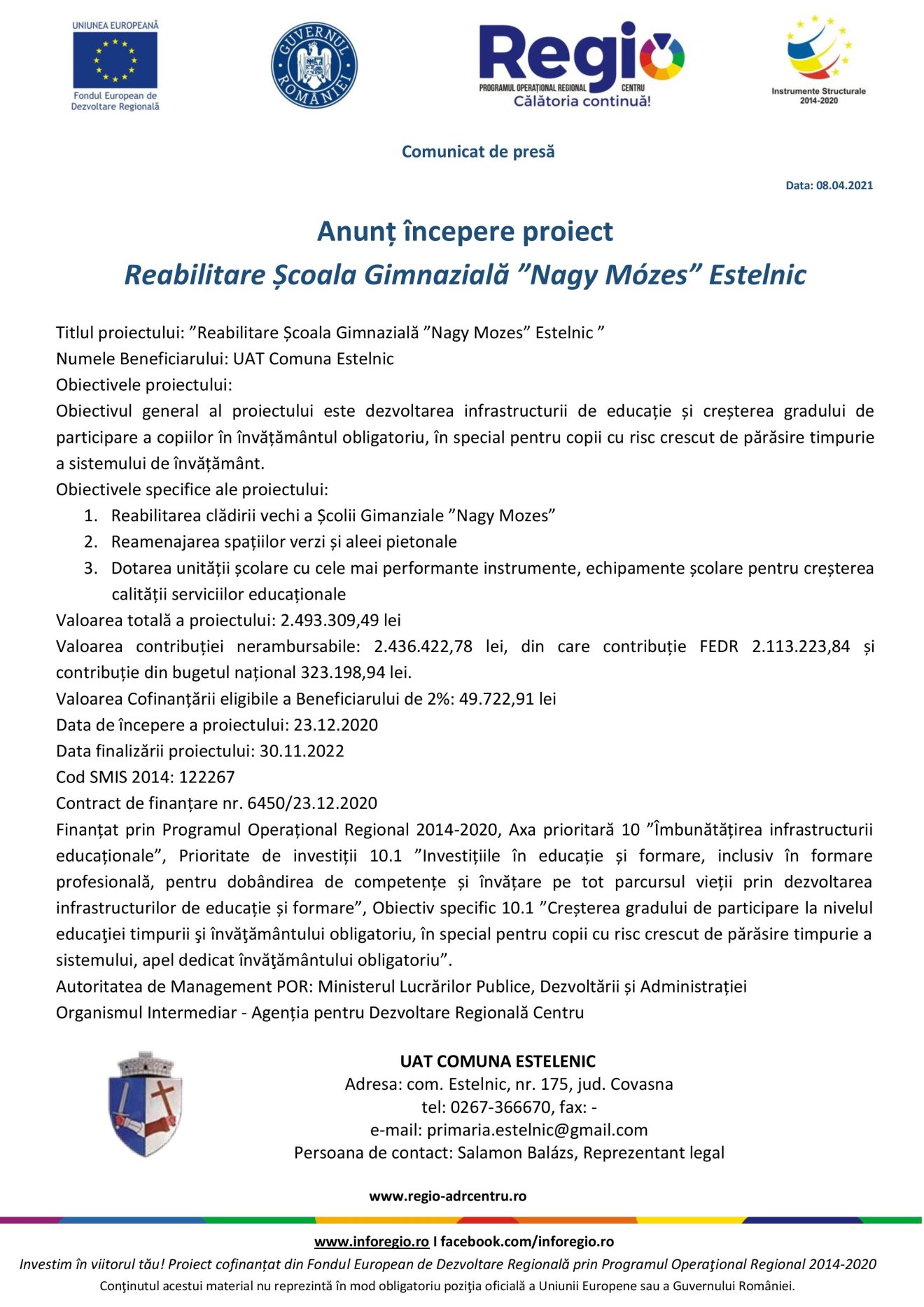 Titlul proiectului: ”Reabilitare Școala Gimnazială ”Nagy Mozes” Estelnic ”