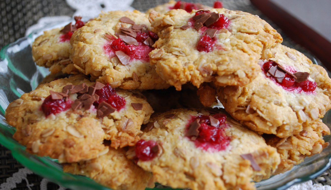 Elkészítés: a vajat felolvasztjuk, hozzáadjuk a mézet vagy szirupot, valamint 1 evőkanál vízzel elkevert kávéskanálnyi szódabikarbónát, majd a tűzről levéve félretesszük. A száraz alapanyagokat összekeverjük a vajas keverékkel, ízesítjük, amivel szeretnénk (ma vörösáfonyacsepp és csoki). A masszából kekszet formázunk, 180 fokos sütőbe toljuk, és 12–13 perc alatt aranyszínűre sütjük.